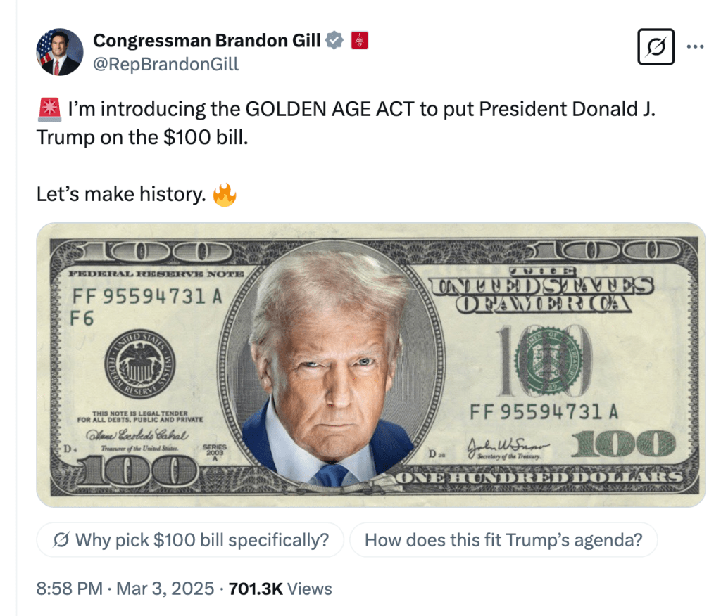 Meclise sunulan tasarının temel önerisi, altın çağın altın lideri Trump’ın resmini 100 dolarlık banknotların üzerine basmak.