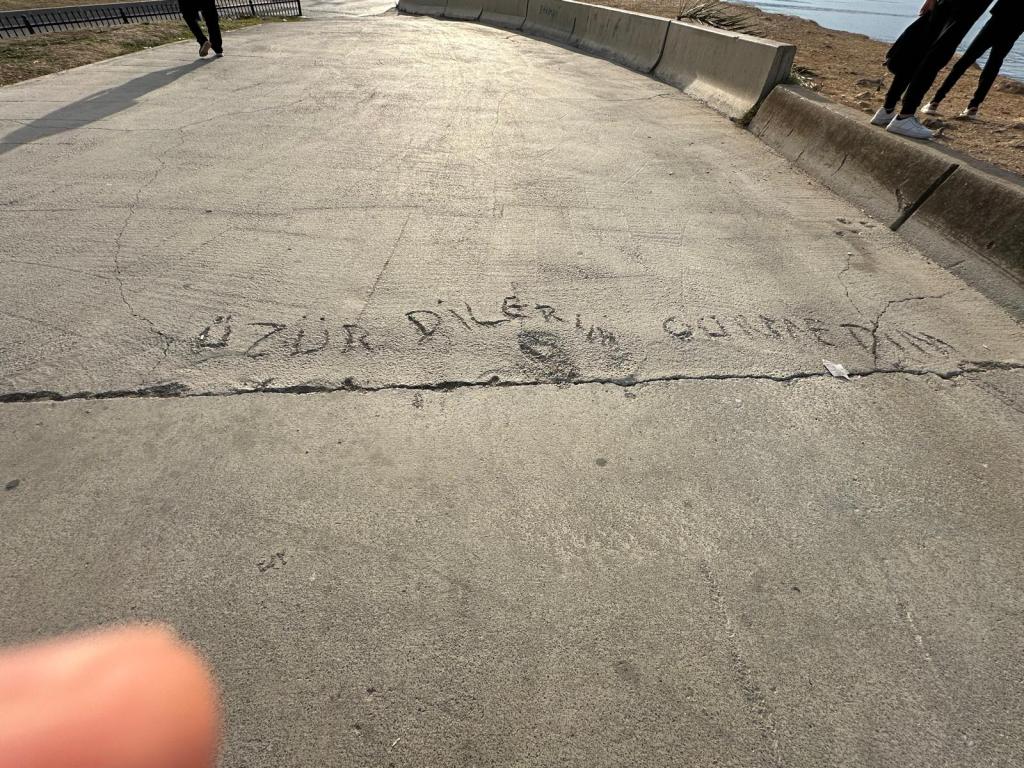 Muhtemelen yeni dökülen betona yanlışlıkla bastığında; özür dileyecek birini aramış, bulamamış. “Bir gözetleyen vardır”, “bir gören olacaktır” “bir emeğe zarar verdim, özür dilemeliyim” diye yaptığı yanlışlığı kayıt altına almış.